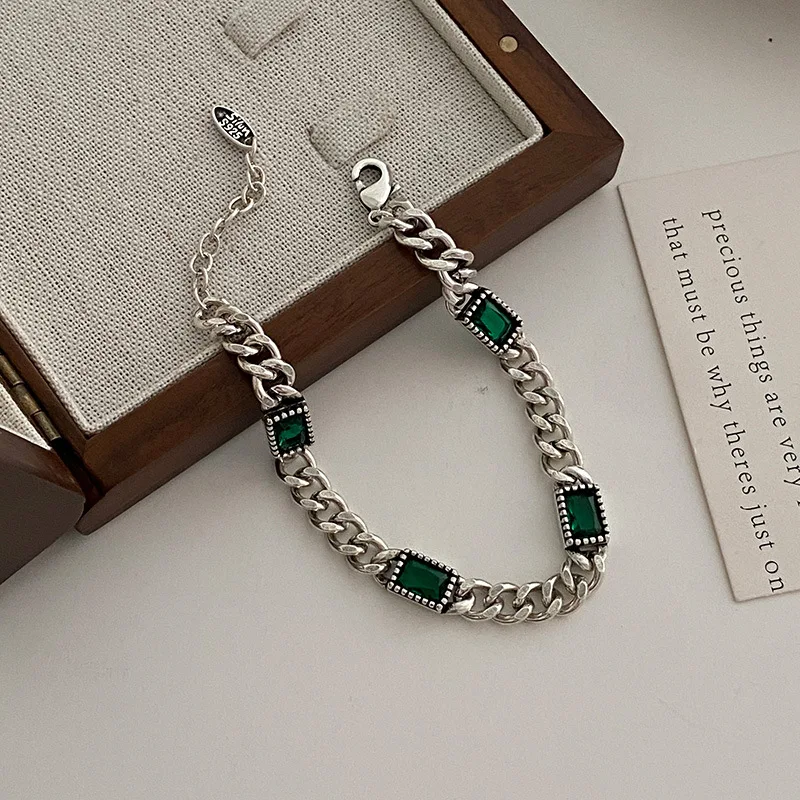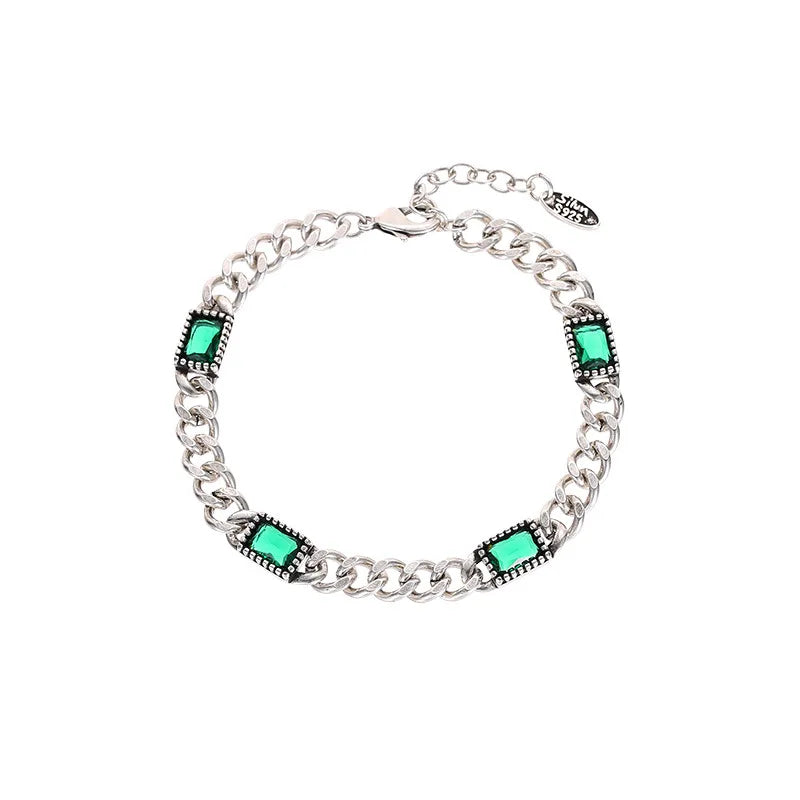 925 Sterling Silver Green Stone Retro Chain Bracelet